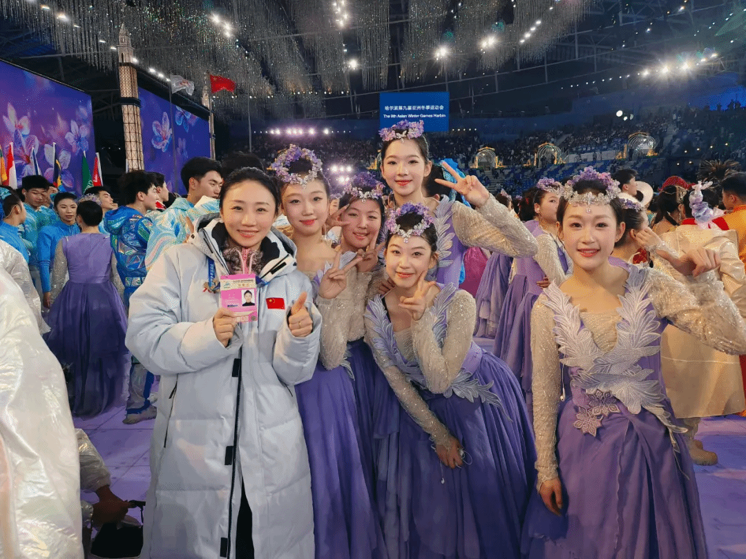 舞蹈系2023级 张研当得知自己能作为舞蹈演员登上亚冬会的舞台时,内心的激动难以言表。这不仅是一场体育盛会,更是一次艺术与体育完美交融的绝佳契机。开幕式的筹备过程紧张而充实,每一个动作、每一次走位,都经过反复打磨。在排练中,我深刻体会到团队协作的重要性。大家齐心协力,为了共同的目标而努力,这种凝聚力让我深受感动。终于,站在亚冬会的舞台上,面对全场观众和全球的目光,紧张与兴奋交织。很荣幸在舞台上成为哈尔滨市花丁香花的一员,让哈尔滨的冬天变的色彩斑澜,那一刻,我感受到了舞蹈的力量,它能够跨越语言和文化的障碍,传递出团结、拼搏的精神。