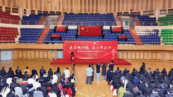 踏入体育馆,五面鲜艳的五星红旗在看台列阵,与高悬的国旗相映成红。国歌声起时,心潮随旗帜一同滚烫。郭书记的思政课里,特意讲了红旗的故事,它曾见证边防战士的风雪坚守。这份“以青春护山河”的赤诚,让我忽然懂了: 我们大学生的担当,就是在专业里沉心积累,在志愿中主动奔赴,像边防战士守疆土那样,守好青春的“责任岗”。